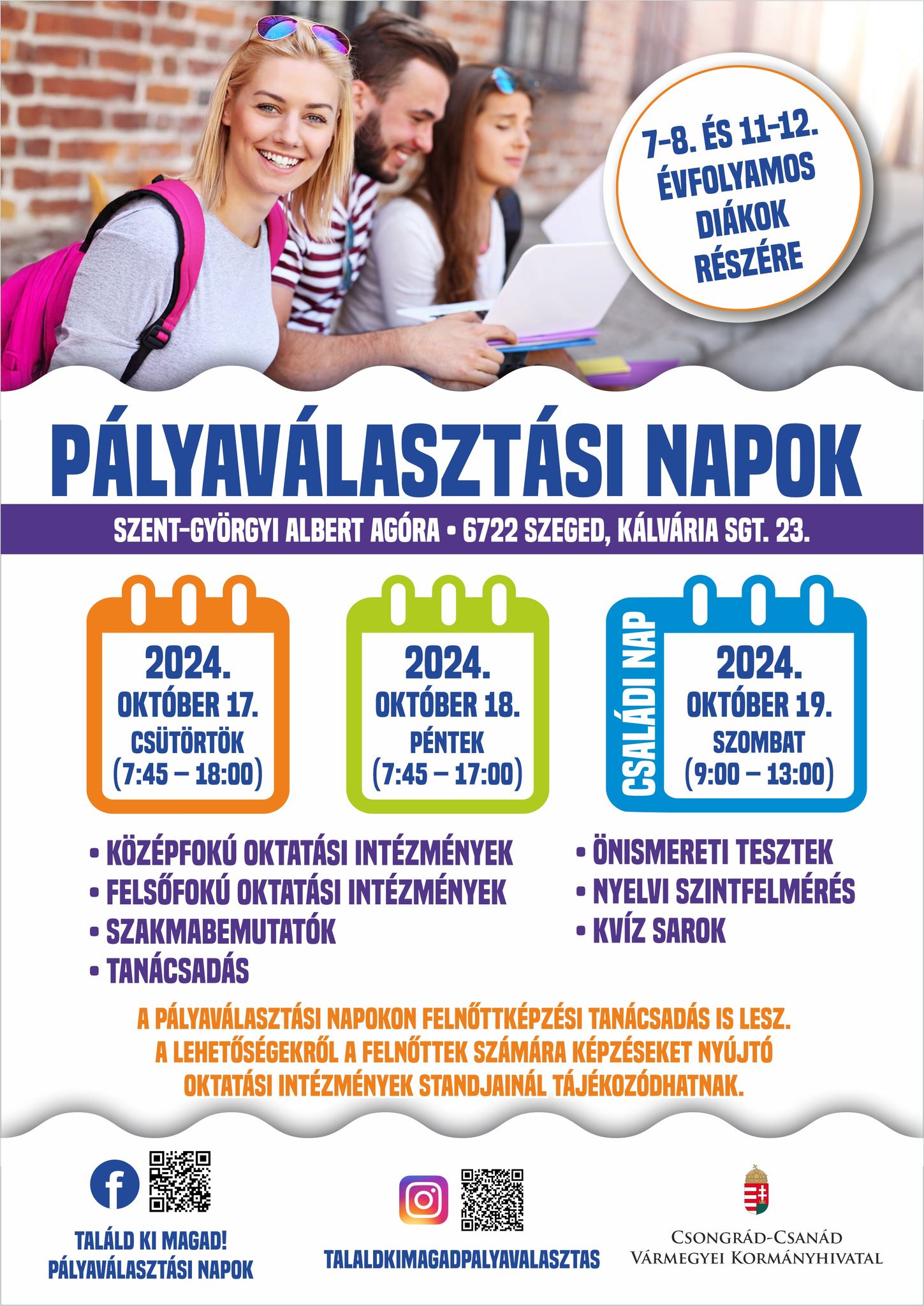 Szeretnénk tájékoztatni Önöket,hogy az október 17-18-19-én a Szent-Györgyi Albert Agórában megrendezésre kerülő Pályaválasztási Kiállításra előzetesen jelentkezni kellett a Kormányhivatal honlapján.