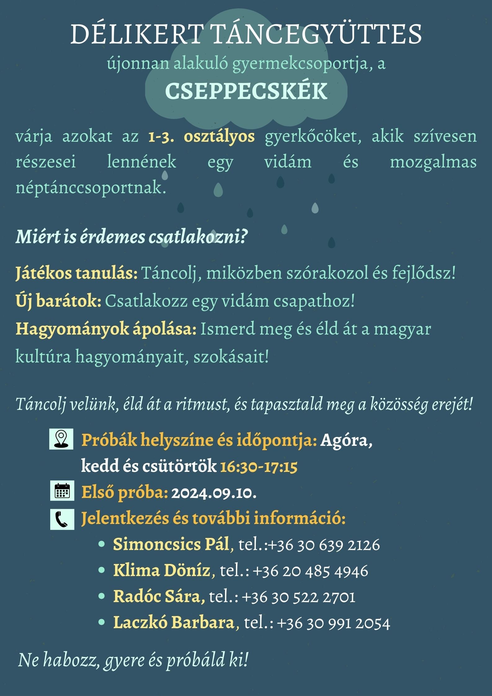 Délikert táncegyüttes újonnan alakuló gyermekcsoportja, a Cseppecskék várja azokat az 1-3. osztályos gyerkőcöket, akik szívesen részesei lennének egy vidám és mozgalmas néptánccsoportnak.