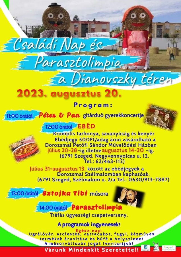 Ebédjegy 500Ft/adag áron vásárolható a Dorozsmai Petőfi Sándor Művelődési Házban 2023 július 28-ig, valamint augusztus 14 - 18 között.