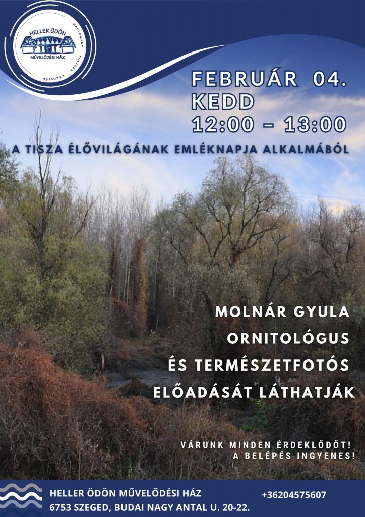 A Tisza élővilágának emléknapja alkalmából Molnár Gyula ornitológus, természetfotós előadását láthatják a Heller Ödön Művelődési Házban. A belépés díjtalan! Várjuk Önöket szeretettel!