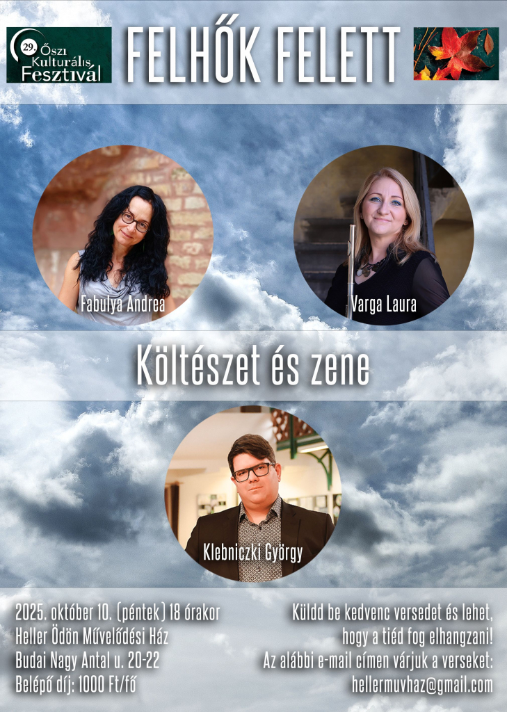 Klebniczki György Felhők felett című fuvolaciklusának ősbemutatója, valamint a Lámpafények című zongoradarabjai hangoznak el. A művek között Fabulya Andrea verseket olvas fel.