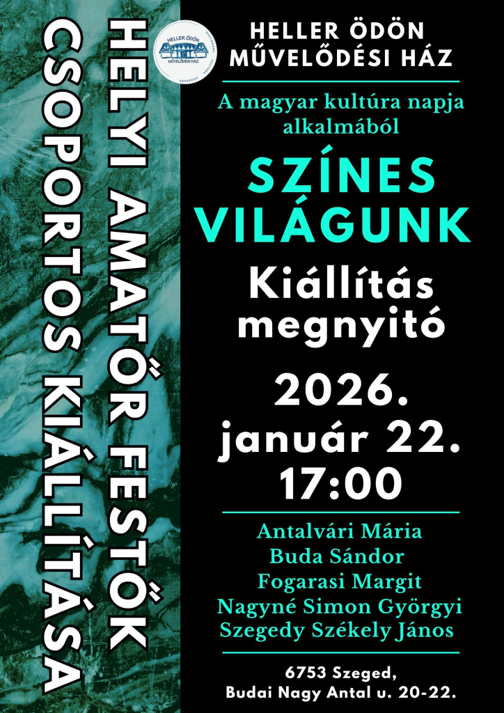 A magyar kultúra napja alkalmából 2026. január 22. 17 órai kezdettel kiállítás megnyitó amatőr festők csoportos kiállítása a Heller Ödön Művelődési Házban.