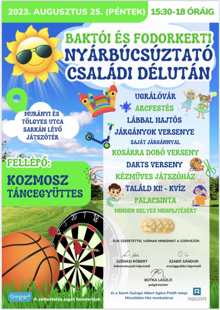 Hagyományainkhoz híven várjuk a családokat a nyár utolsó péntekjén Fodorkertbe a Murányi utcai játszótérre. Fellép a Kozmosz táncegyüttes. Arcfestéssel jön Katandi, lesz kézműveskedés és ugrálóvár is. Lábbal hajtós járművek versenye, kosárra dobás, darts, TALÁLD KI KVÍZ és sok sok palacsinta. A rendezvény ingyenes!!!
