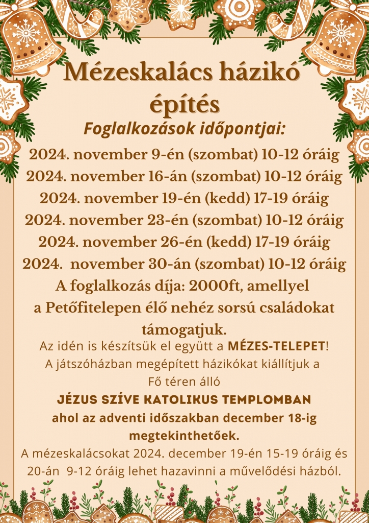 A mézeskalácsokat 2024. december 19-én 15-19 óráig és 20-án 9-12 óráig lehet hazavinni a művelődési házból.