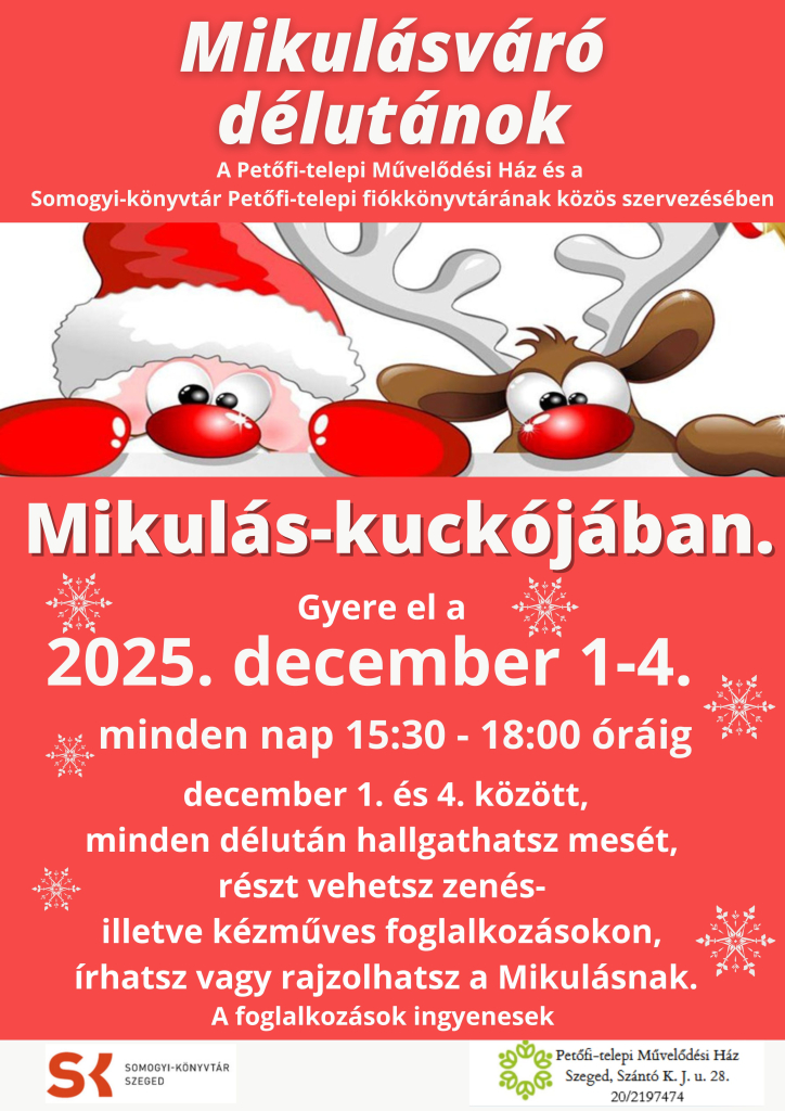Most a gyerekekre gondoltunk és egy új kezdeményezéssel szeretnénk a Mikulás hetében kedveskedni a legkisebbeknek. December 1-4. 15:30-18:00 óra között a Somogyi-könyvtár Petőfi-telepi fiókkönyvtára felső szintjén a Mikulás kuckóját rendeztük be. Itt lesz a Mikulás-levelesládája is. Lehet levelet írni, rajzolni a Jóöregnek. Mi is Varga Norbi könyvtáros kollégával kiegészülve minden nap készülünk hol kézműveskedéssel, mesével, zenés foglalkozással a hozzánk betérőknek. Egy kis tea, mézeskalács, vidámság és gyorsan elmúlnak a szürke hétköznapok!!! Ha kedvet kaptál, jelezd felénk a részvételi szándékodat a 20/9528656-os telefonszámon. A rendezvény ingyenes.