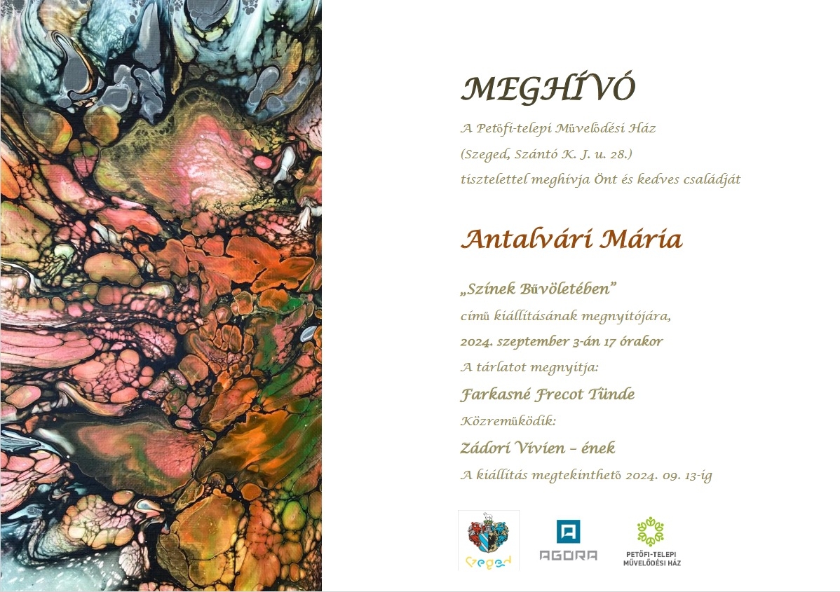 Sok szeretettel meghívjuk Önt és kedves családját Antalvári Mária "Színek bűvöletében" című kiállításának megnyitójára. A tárlatot megnyitja: Farkasné Frecot Tünde Közreműködik: Zádori Vivien-ének A kiállítás megtekinthető 2024. 09. 03-13.