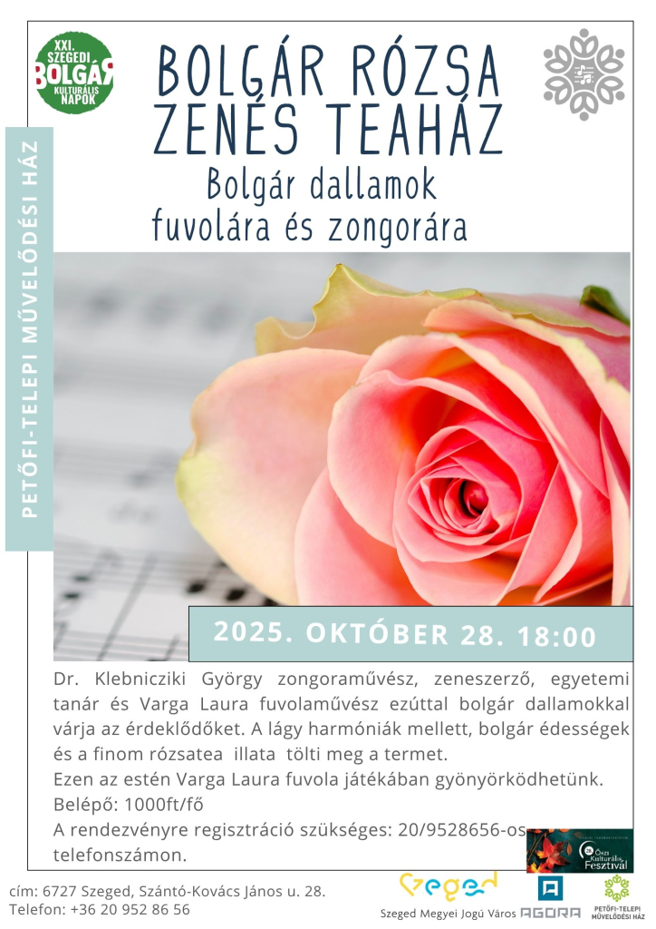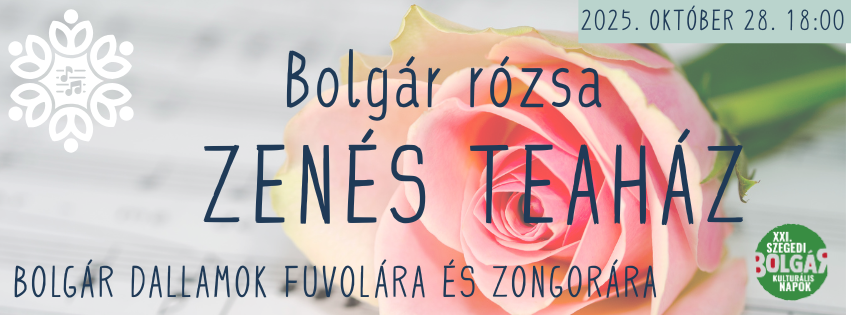 Dr. Klebnicziki György zongoraművész, zeneszerző, egyetemi tanár és Varga Laura fuvolaművész ezúttal bolgár dallamokkal várja az érdeklődőket. A lágy harmóniák mellett, bolgár édességek és a finom rózsatea illata tölti meg a termet.