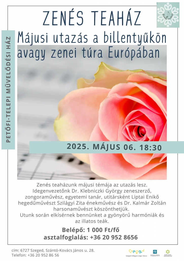 Zenés teaházunk májusi témája az utazás lesz. Idegenvezetőnk Dr. Klebniczki György zeneszerző, zongoraművész, egyetemi tanár, utitársként Liptai Enikő hegedűművészt, Szilágyi Zita operaénekest és Dr. Kalmár Zoltán harsonaművészt köszönthetjük.