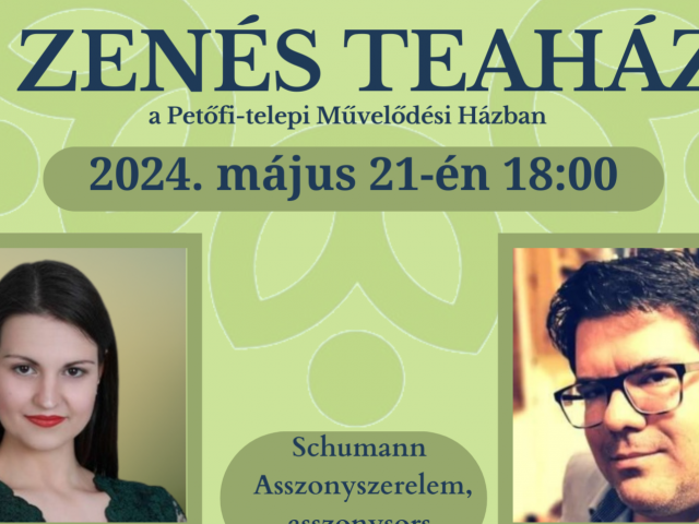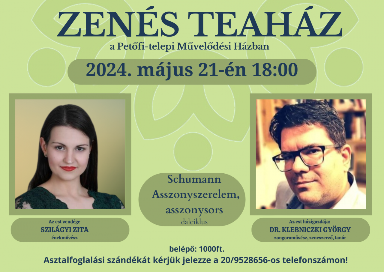 Ismét várjuk a klasszikus zene szerelmeseit ZENÉS TEAHÁZUNKBAN. A házigazda Klebniczki György zongoraművész, művésztanár, vendége Szilágyi Zita énekművész. Asztalfoglalás: 20/2197474 telefonszámon. Belépő: 1000ft