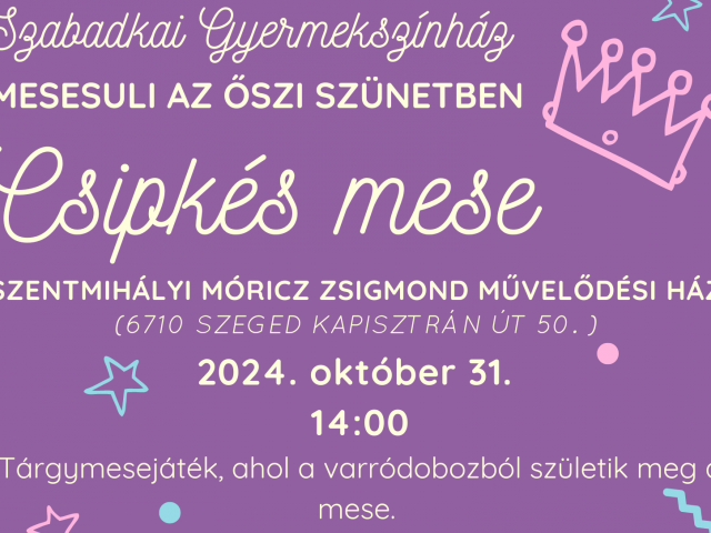 Egy különleges előadásra várjuk a kisiskolásokat és kísérőiket. A Szabadkai Gyermekszínház Csipkés mese c. tárgymese-játékát mutatja be.