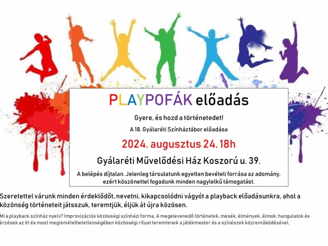 Szeretettel várunk minden érdeklődőt, nevetni, kikapcsolódni vágyót a playback előadásunkra, ahol a közönség történeteit játsszuk, teremtjük, éljük át újra közösen.