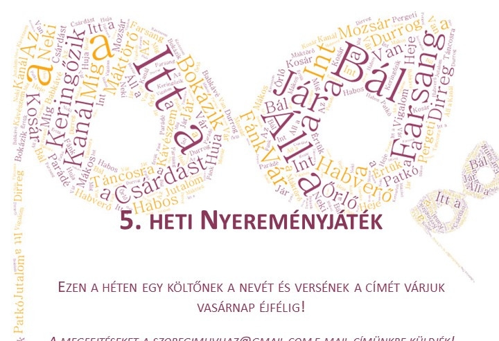 Ezen a héten egy költőnek a nevét és versének a címét várjuk vasárnap éjfélig! A megfejtéseket a szoregimuvhaz@gmail.com e-mail címünkre küldjék! Azok között, akik jó megfejtést küldenek be, egy tárgynyeremény sorsolunk ki! A sorsolásra hétfőn kerül sor, a nyertest külön értesítjük!