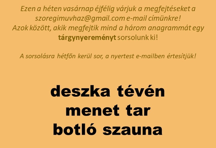 Ezen a héten vasárnap éjfélig várjuk a megfejtéseket a szoregimuvhaz@gmail.com e-mail címünkre! Azok között, akik megfejtik mind a három anagrammát egy tárgynyereményt sorsolunk ki! A sorsolásra hétfőn kerül sor, a nyertest e-mailben értesítjük!