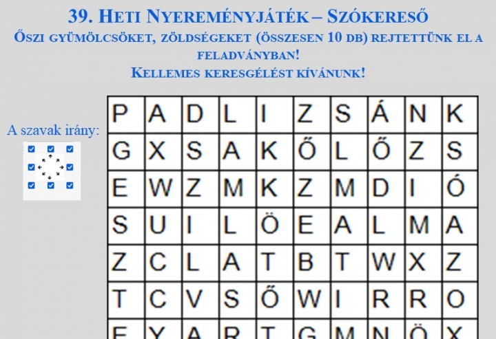 Őszi gyümölcsöket, zöldségeket (összesen 10 db) rejtettünk el a feladványban!
