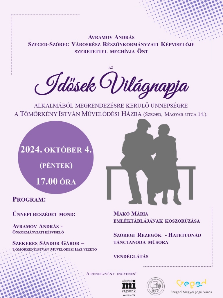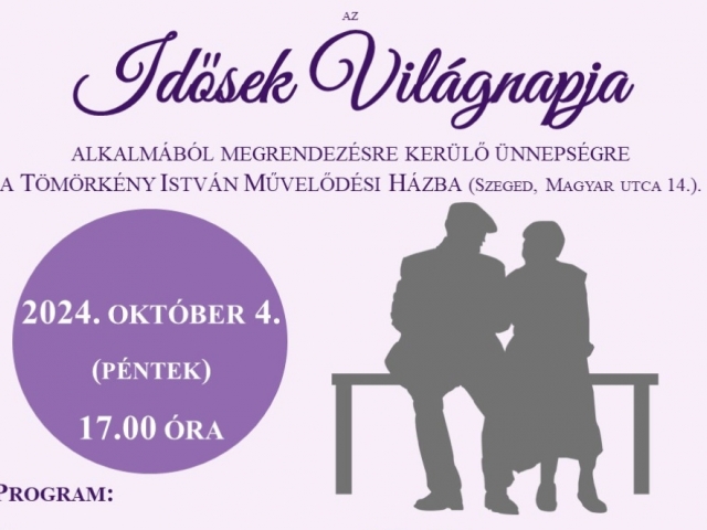 Szeretettel meghívjuk az Idősek Világnapja alkalmából megrendezésre kerülő ünnepségre, a Tömörkény István Művelődési Házba (Szeged, Magyar utca 14.)