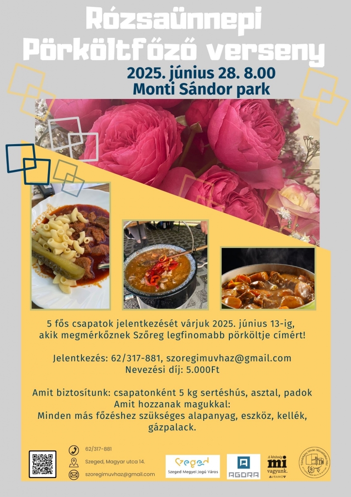 5 fős csapatok jelentkezését várjuk 2025. június 13-ig, akik megmérkőznek Szőreg legfinomabb pörköltje címért!