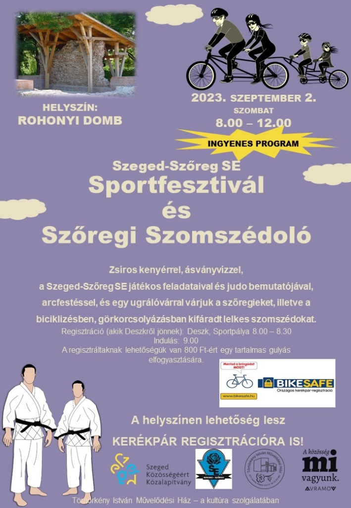 Zsíros kenyérrel, ásványvízzel, a Szeged-Szőreg SE játékos feladataival és judo bemutatójával, arcfestéssel, és egy ugrálóvárral várjuk a szőregieket, illetve a biciklizésben, görkorcsolyázásban kifáradt lelkes szomszédokat.