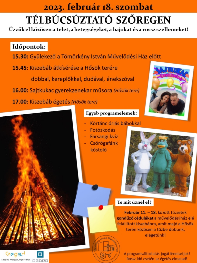 Február 11. – 18. között tűzzetek gondűző cédulákat a művelődési ház elé felállított kiszebábra, amit majd a Hősök terén közösen a tűzbe dobunk, elégetünk!