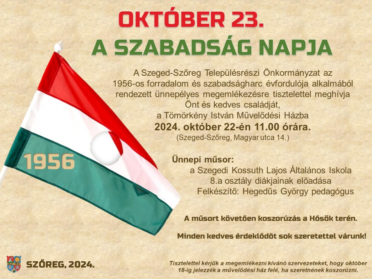 A Szeged-Szőreg Településrészi Önkormányzat az 1956-os forradalom és szabadságharc évfordulója alkalmából rendezett ünnepélyes megemlékezésre tisztelettel meghívja Önt és kedves családját,