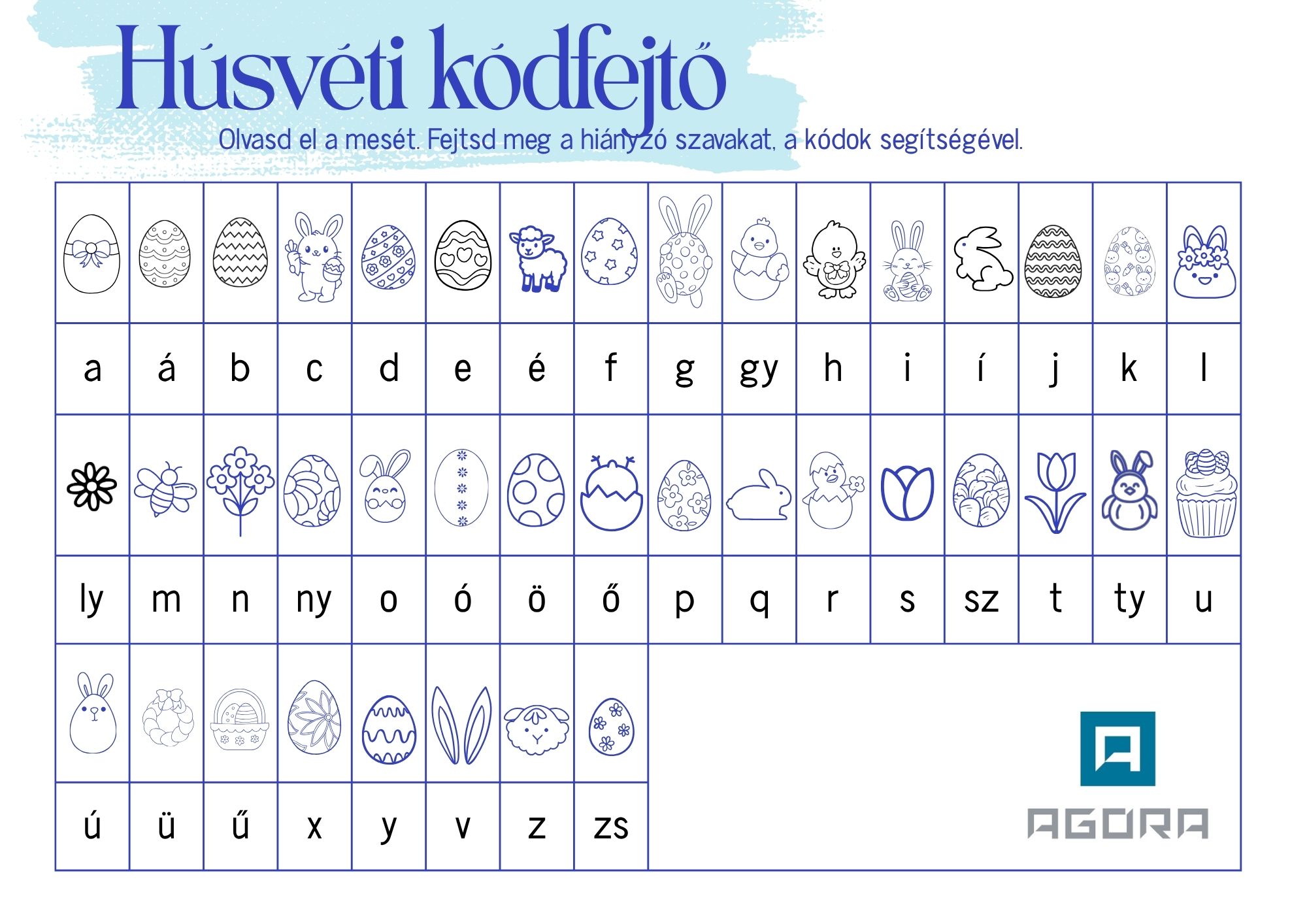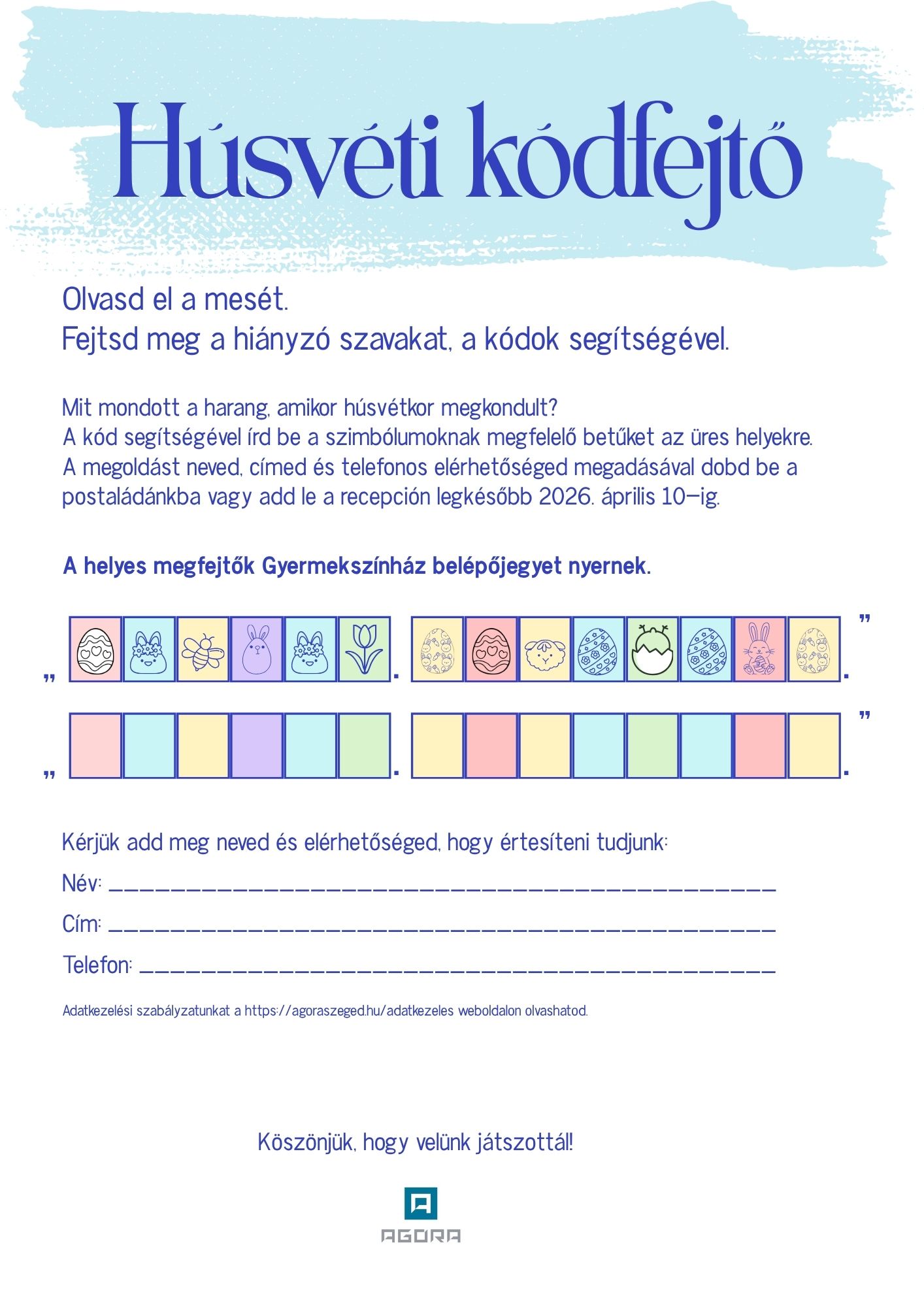 Az Agóránál húsvétkor is játszhatsz! A főbejáratunkra egy furfangos feladványt helyeztünk ki. Olvasd el a mesét és fejtsd meg a hiányzó szavakat, a kódok segítségével.