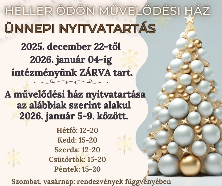 A művelődési ház nyitvatartása az alábbiak szerint alakul 2026. január 5-9. között.