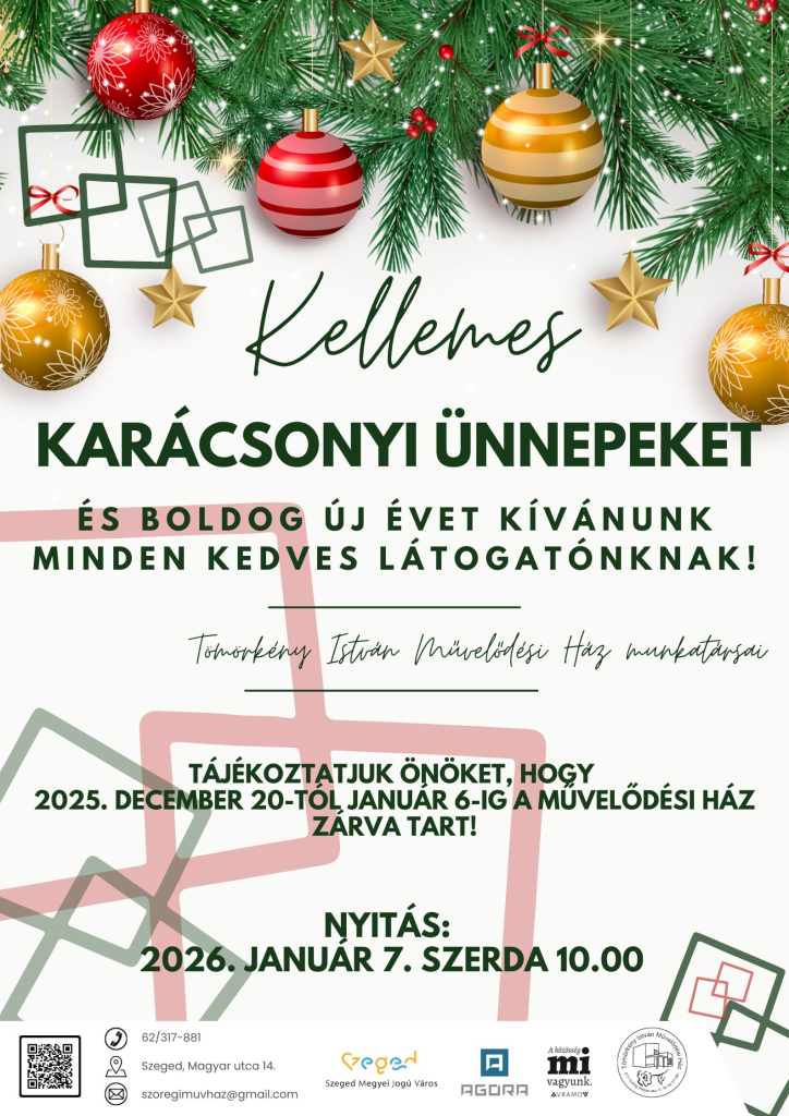 Tájékoztatjuk Önöket, hogy december 20-tól január 6-ig a művelődési ház zárva tart!