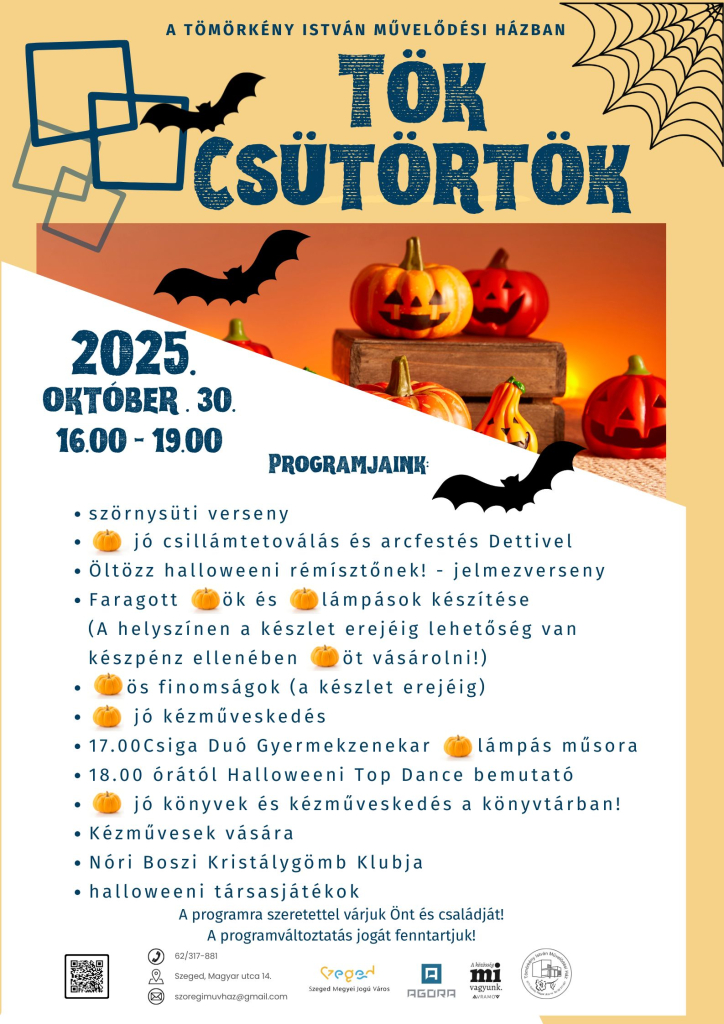 - Faragott tökök és töklámpások készítése (A helyszínen a készlet erejéig lehetőség van készpénz ellenében tököt vásárolni!)