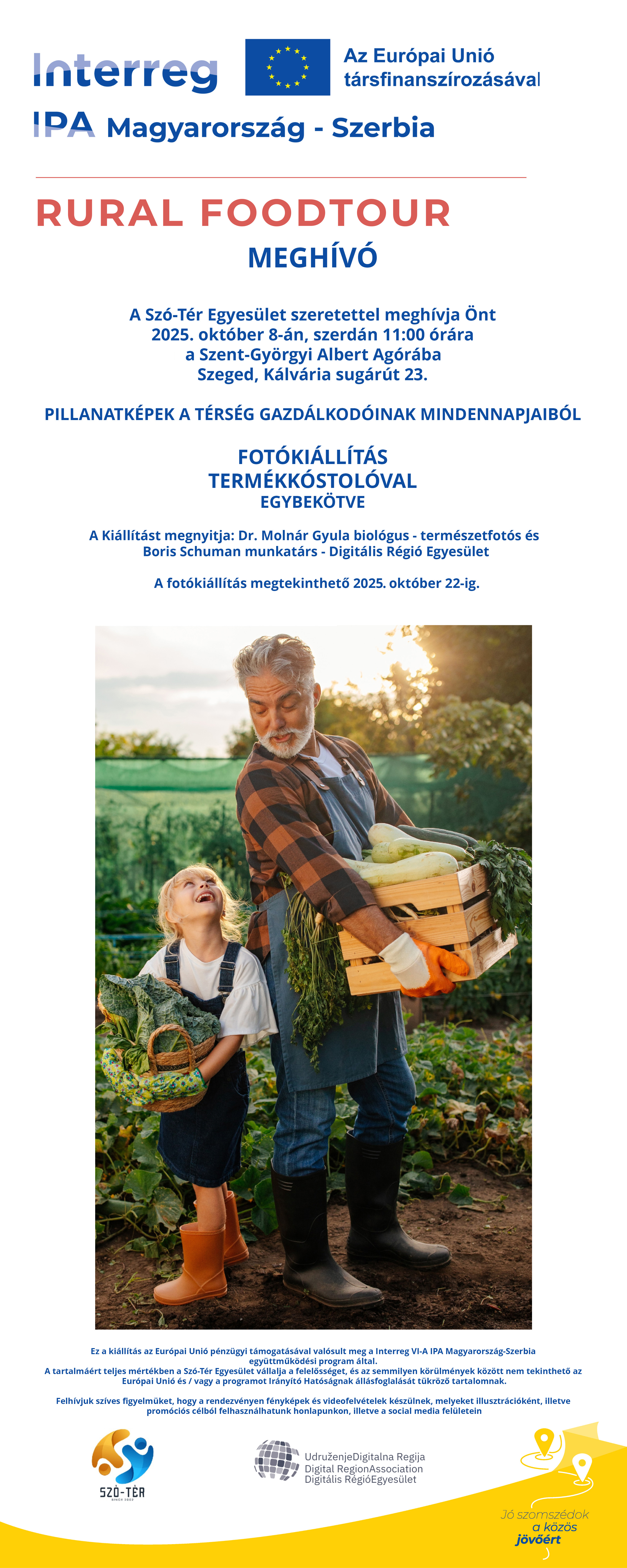 A Szó-Tér Egyesület szeretettel vár minden érdeklődőt 2025. október 08-án 11:00 órakor a Szent-Györgyi Albert Agórába (Szeged, Kálvária sgt. 23.), a "Pillanatképek a térség gazdálkodóinak mindennapjaiból" című kiállításának megnyitójára, termék kóstolóval egybekötve.