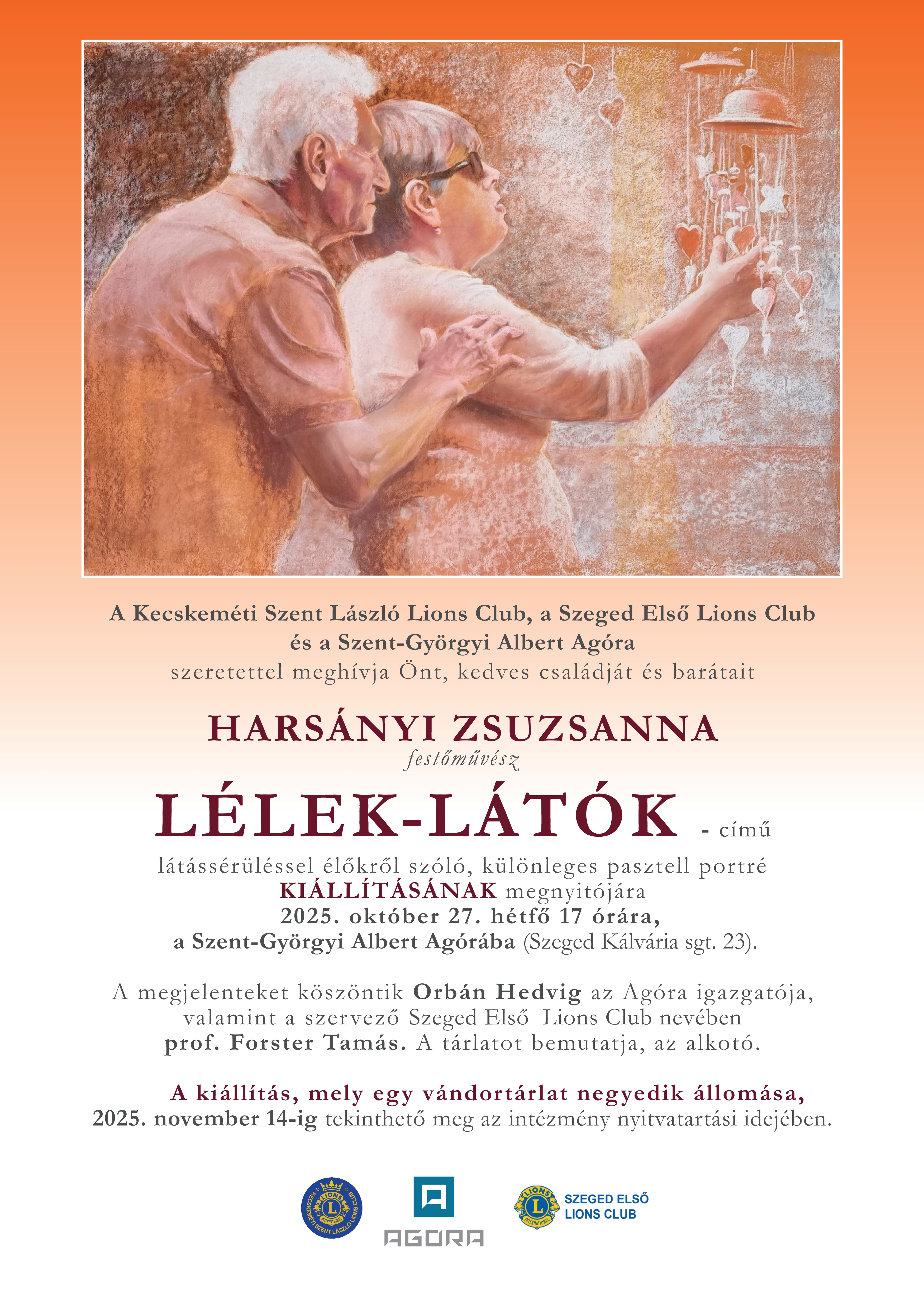 A megjelenteket köszönti Orbán Hedvig igazgató és a szervező Szeged Első Lions Club nevében prof. Forster Tamás. A tárlatot bemutatja az alkotó.