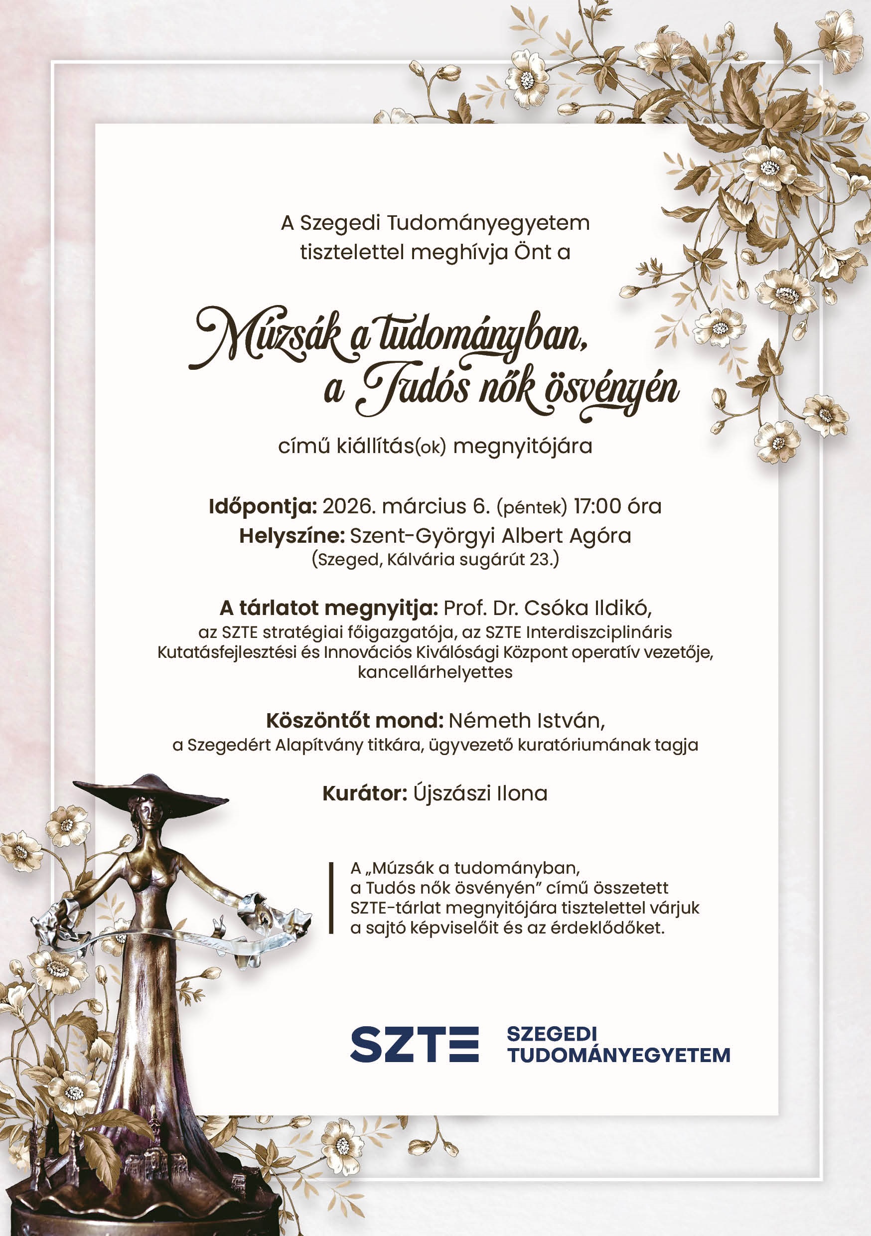 A „Tudós nők ösvényén” című kiállítás az SZTE Füvészkertben kialakított Tudós nők ösvénye projekt kerámia-sorozatának Szűcs Eszter Anita iparművész által készített grafikai terveit mutatja be. A növényi termések ihlette alkotásokkal az SZTE olyan tudós nők előtt tiszteleg, mint a Nobel-díjas mRNS-kutató Karikó Katalin (1955 –), Banga Ilona (1906-1998) biokémikus, Csapody Vera (1890-1985) botanikus, Gábor Aranka (1922-1981) gyógyszerész, Kopasz Márta (1911-2011) festő- és grafikusművész, Ormos Mária (1930-2019) történész, Wollemann Mária (1923-2019) orvos, biokémikus. A tárlat a Szent-Györgyi Albert Agóra (Szeged, Kálvária sgt. 23.) I. emeleti kiállítási terében 2026. március 6-tól 27-ig várja a látogatókat.