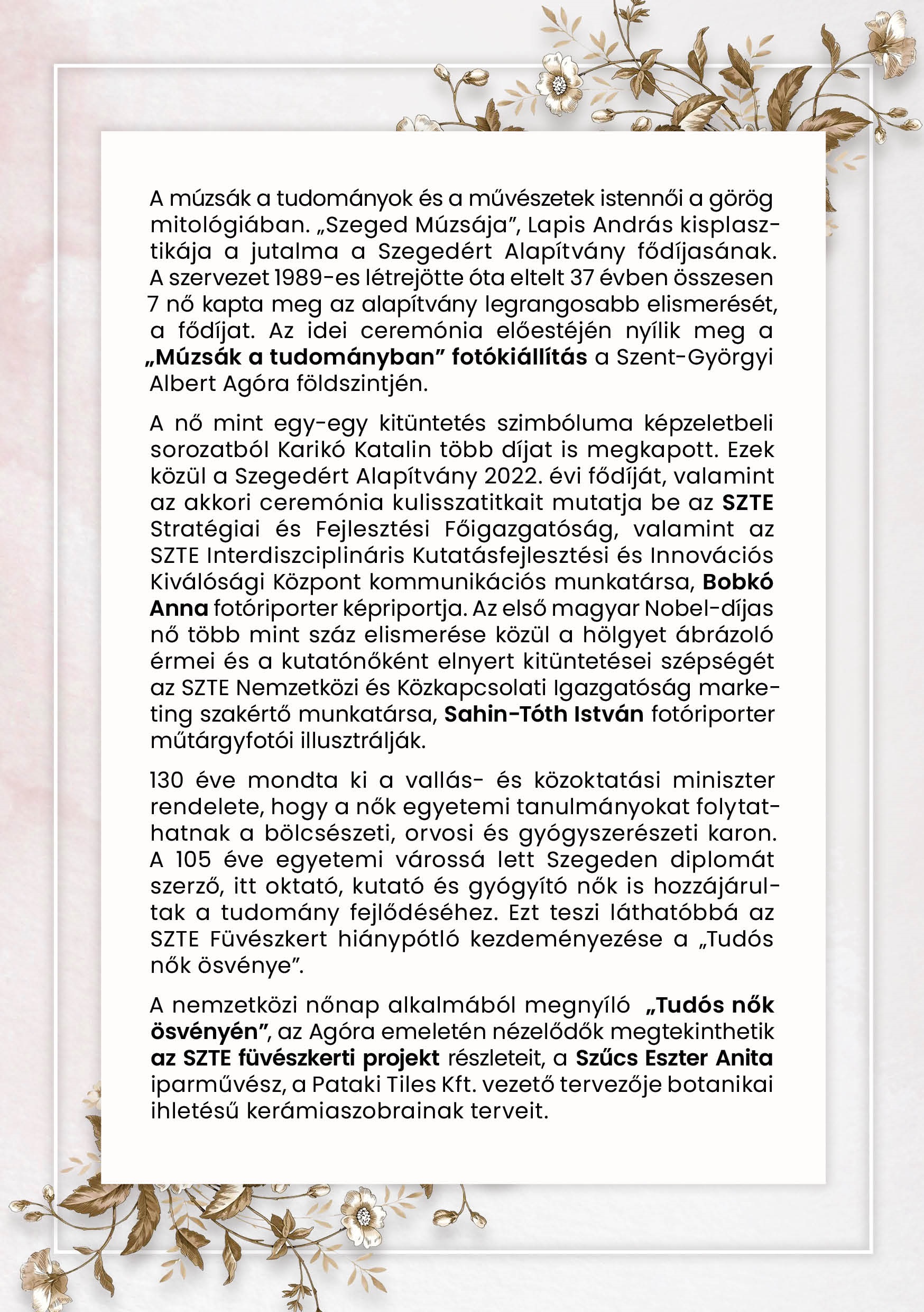 Az SZTE „Múzsák a tudományban” című fotótárlat az első magyar Nobel-díjas kutatónő, a Szegedi Tudományegyetem professzora, Karikó Katalin száznál is több elismerése közül mutat be néhányat. A „Szeged múzsája”, a Szegedért Alapítvány fődíja átadási ünnepségének különleges pillanatait Bobkó Anna (SZTE SFF – IKIKK kommunikációs munkatárs) képriportja adja vissza. A tudományos teljesítményt elismerő kitüntetésekhez tartozó, a természet és a múzsák ihlette alkotásoknak a szépségét Sahin-Tóth István (SZTE NKI) műtárgyfotói ábrázolják. A sajtó- és műtárgyfotókat fölvonultató tárlat a Szent-Györgyi Albert Agóra (Szeged, Kálvária sgt. 23.) földszinti kiállítási terében 2026. március 6-tól 31-ig tekinthető meg.