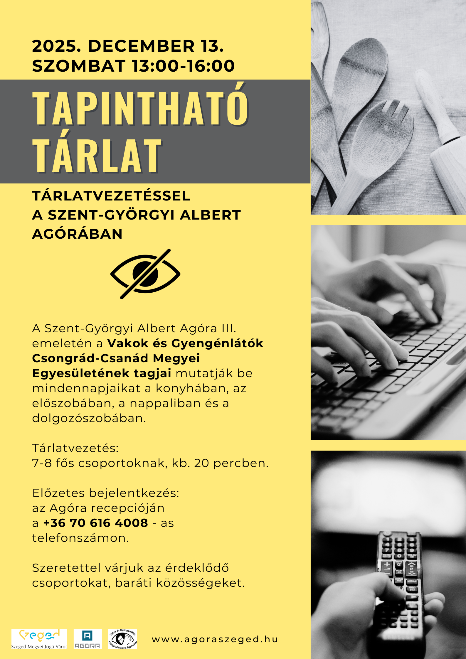 A Szent-Györgyi Albert Agóra III. emeletén a Vakok és Gyengénlátók Csongrád-Csanád Megyei Egyesületének tagjai mutatják be mindennapjaikat a konyhában, az előszobában, a nappaliban és a dolgozószobában.